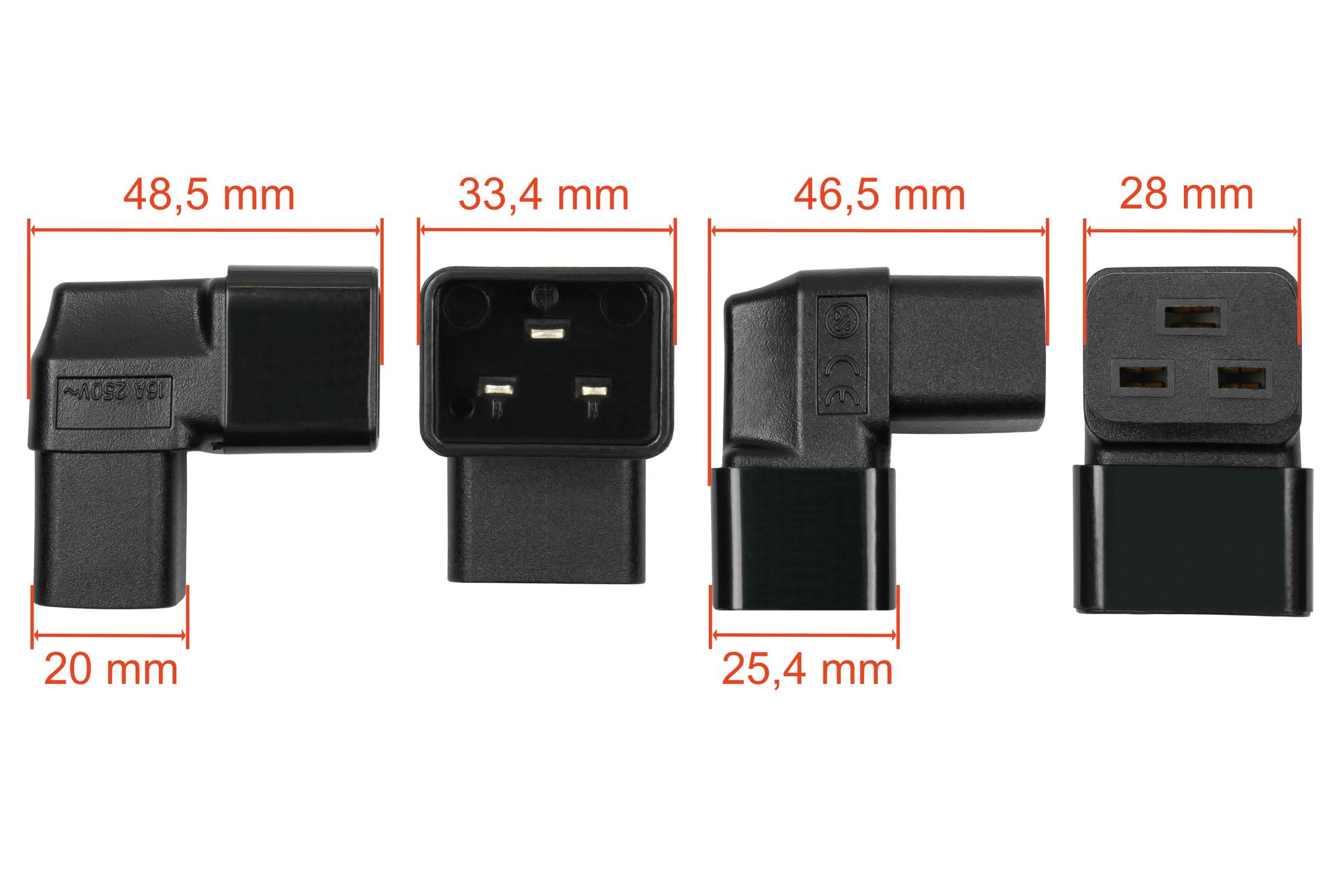 kabelmeister® Stromadapter Kaltgeräte-Stecker C20 an Kaltgeräte-Buchse C19, oben/unten abgewinkelt, schwarz