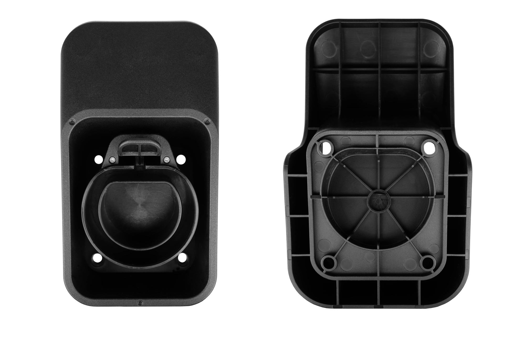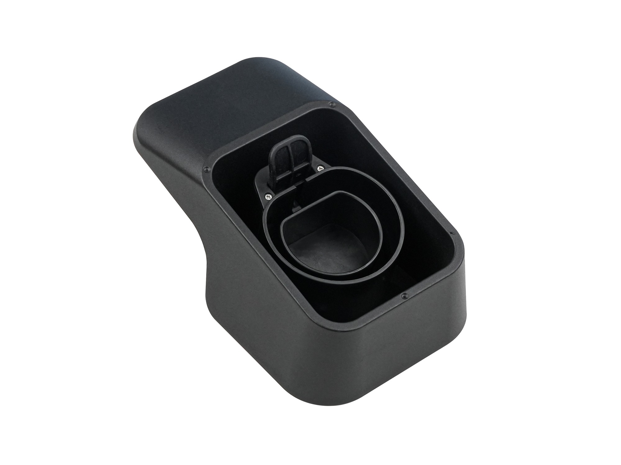 Die platzsparende Ladekabelhalterung ist leicht nach unten abgewinkelt, sodass das eingesteckte Ladekabel vor dem Eindringen von Regenwasser, Feuchtigkeit, Schnee, Staub und Schmutz geschützt ist. Je nach Länge des eingesetzten Ladekabels wird verhindert, dass das Kabel auf dem Boden liegt und somit negativen Umwelteinflüssen ausgesetzt ist.