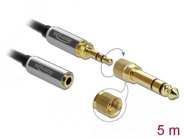 Klinkenverlängerungskabel, 3,5mm 3-Pin Stecker zu Buchse, mit 6,35mm Schraubadapter, schwarz, 5m, Delock® [85783]