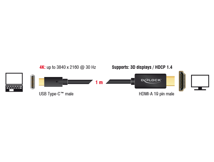 Kabel USB Type-C Stecker an HDMI Stecker (DP Alt Mode), 4K 30Hz, schwarz, 1m, Delock® [85258]