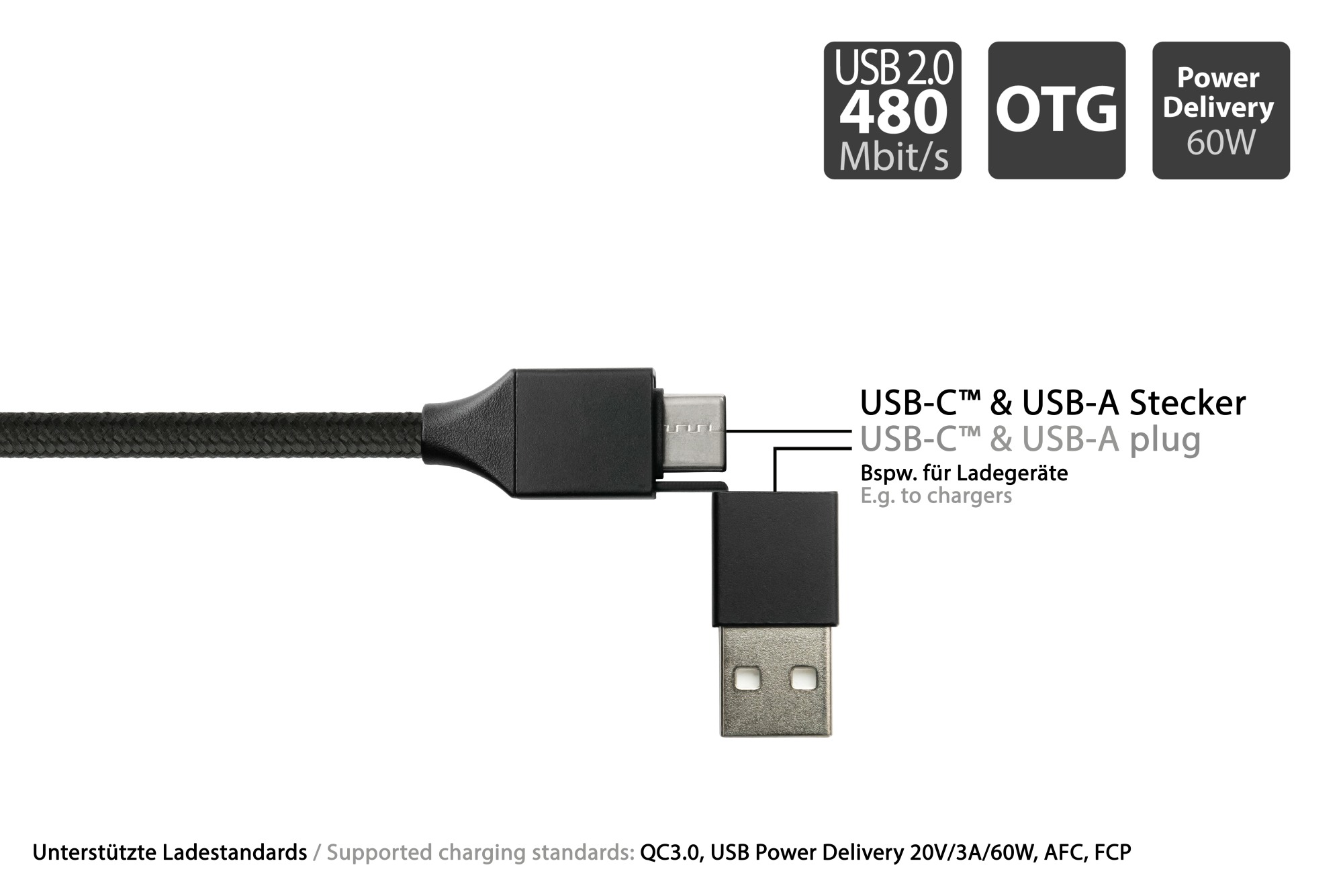 Seine zwei verschiedenen Kombinationsmöglichkeiten machen dieses USB-Kabel mit stylischem und robusten Textilgeflecht zu einem unverzichtbaren Zubehör auf Reisen, im Büro oder zuhause. Durch den einseitig angebrachten, passgenauen USB-A Adapter können Sie dieses USB-C™ Kabel auch an Geräten mit USB-A Buchse verwenden.