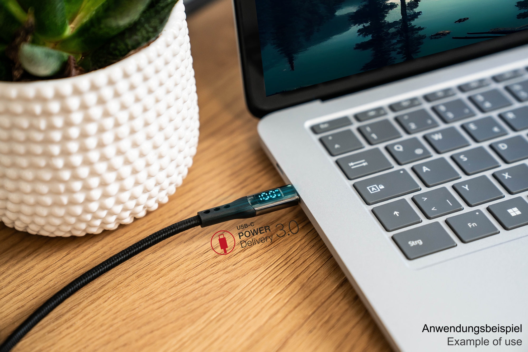In einem der beiden USB-C™ Stecker ist eine hochwertige Digitalanzeige verbaut. Diese liefert in Echtzeit Informationen über die aktuelle Ladeleistung und darüber, ob das Power-Delivery-Protokoll unterstützt wird. So können Sie beispielsweise auf einen Blick feststellen, ob ein Ladegerät tatsächlich die angegebene Wattzahl liefert und das Power Delivery Protokoll unterstützt.