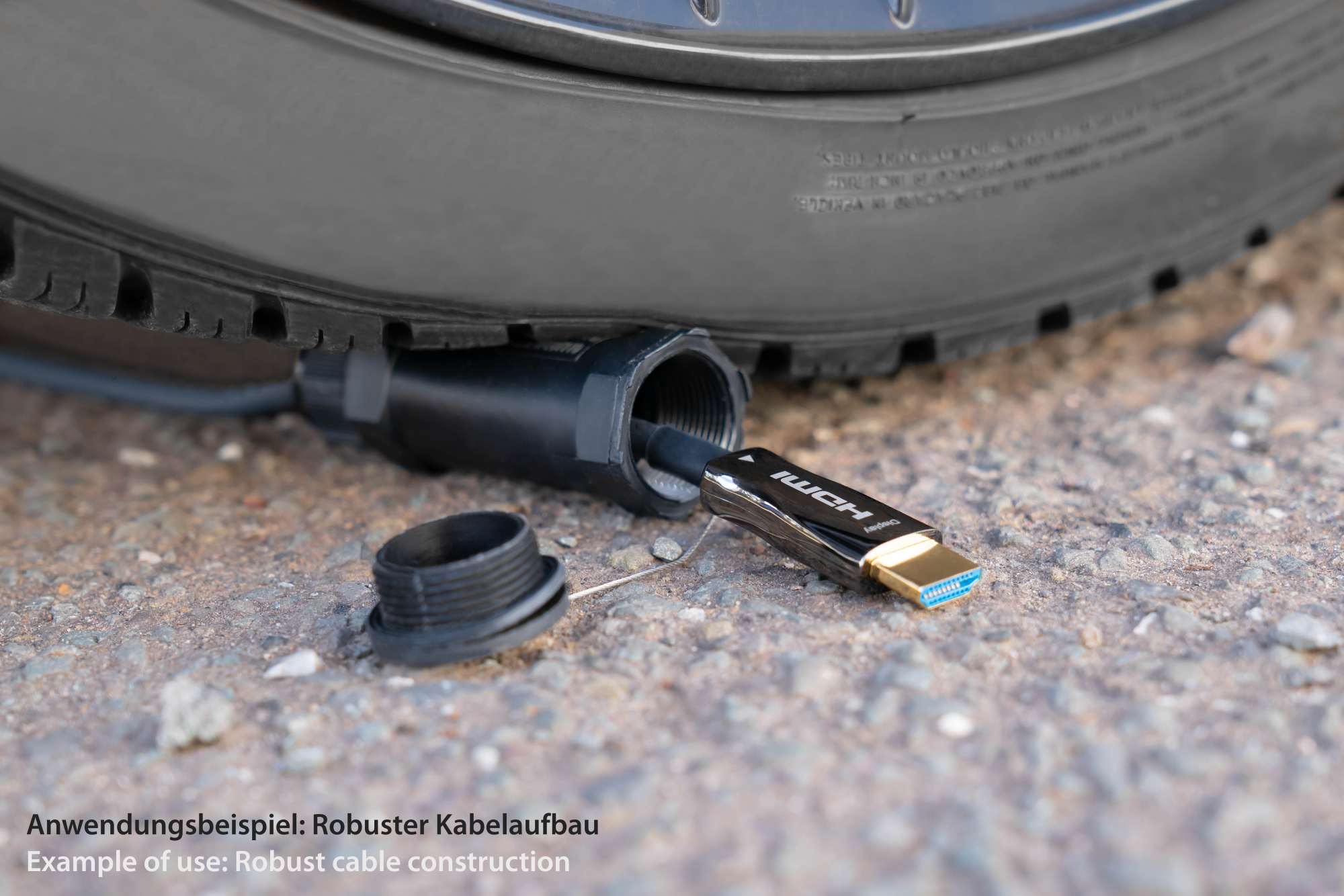 Im Vergleich zu Standard AOC-Kabeln ist die Ausführung mit Stahlarmierung und TPU-Kabelmantel im Inneren neben den Kevlarfasern (Aramid) zusätzlich durch ein flexibles und gepanzertes Stahlrohr geschützt. Durch diesen hochwertigen und robusten Kabelaufbau ist das Kabel trittfest, bietet Schutz vor Nagetieren und kommt überall zum Einsatz, wo es auf höchste Zuverlässigkeit ankommt. Als Kabelmaterial kommt hochwertiges und halogenfreies TPU-Material zum Einsatz. Neben Flexibilität und Stabilität verbindet es Langlebigkeit durch UV-, Säure-, Alkali- und Öl-Resistenz mit sicherheitsrelevanten Eigenschaften wie flammhemmendes, raucharmes und selbstlöschendes Brandverhalten. Die langlebigen, robusten und präzise gefertigten HDMI-Stecker sind in verzinkten Vollmetallgehäusen untergebracht und sorgen für einen sicheren Halt und eine perfekte Übertragungsqualität. Ist das Kabel nicht in Benutzung können die beiden Stecker in den an den Enden angebrachten Schraubgehäusen untergebracht werden und sind so gegen negative Umwelt- und Witterungseinflüsse geschützt.