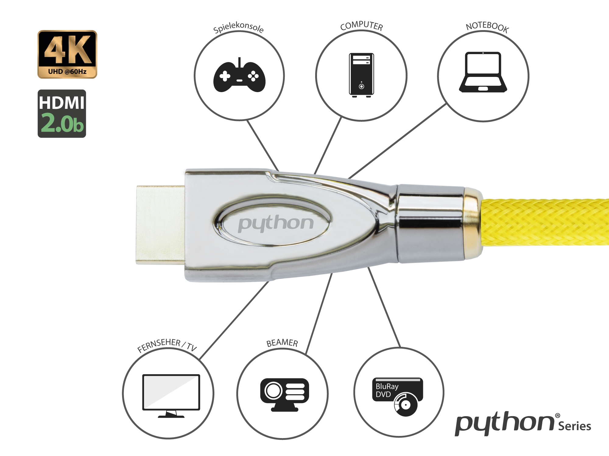 Anschlusskabel HDMI® 2.0 Kabel 4K2K / UHD 60Hz, 24K vergoldete Kontakte, OFC, Nylongeflecht gelb, 2m, PYTHON® Series
