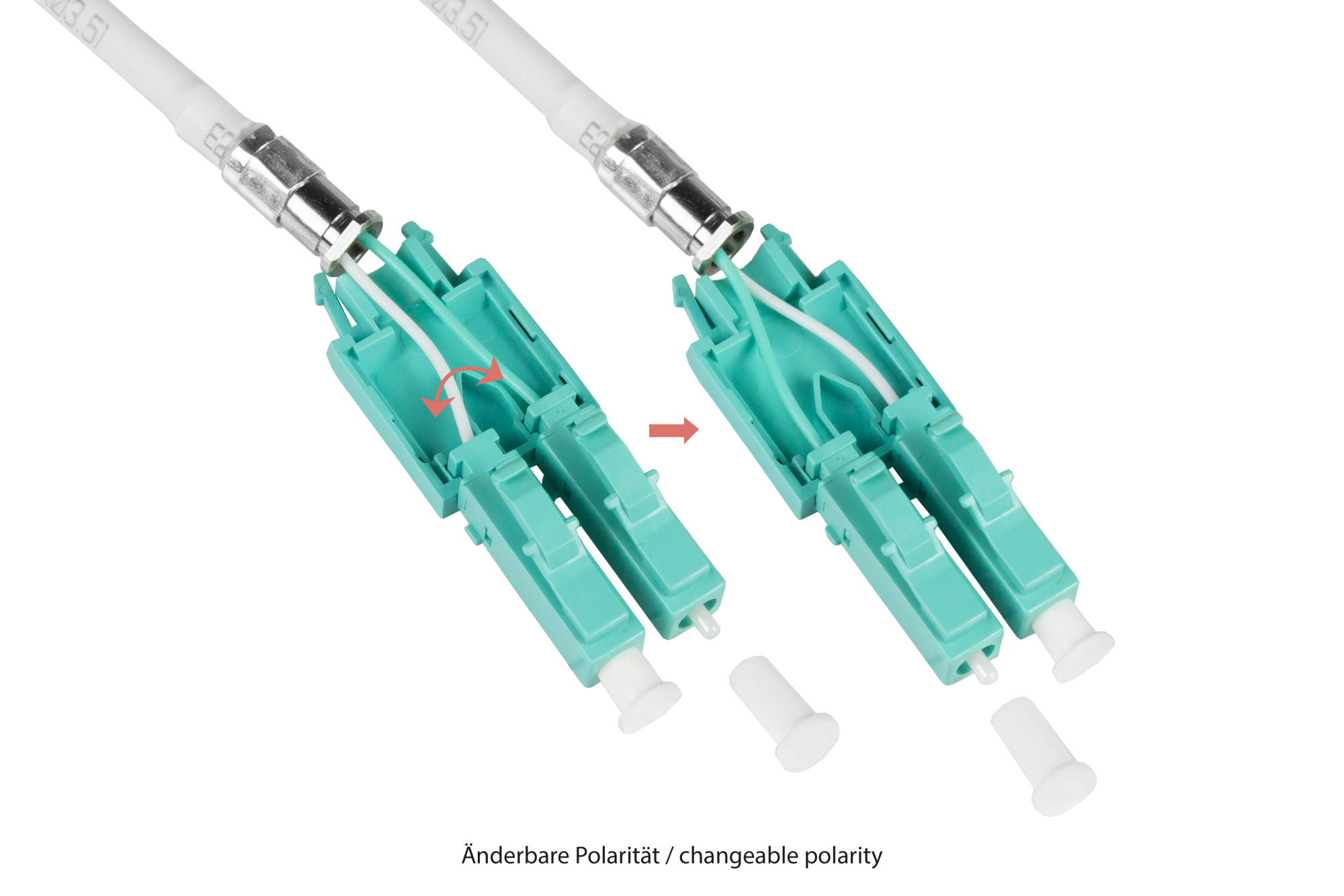 Patchkabel LWL Duplex OM3 (Multimode, 50/125) LC/LC, UNIBOOT, LSZH, austauschbare Polarität, Entriegelungslasche, 3m, Good Connections®