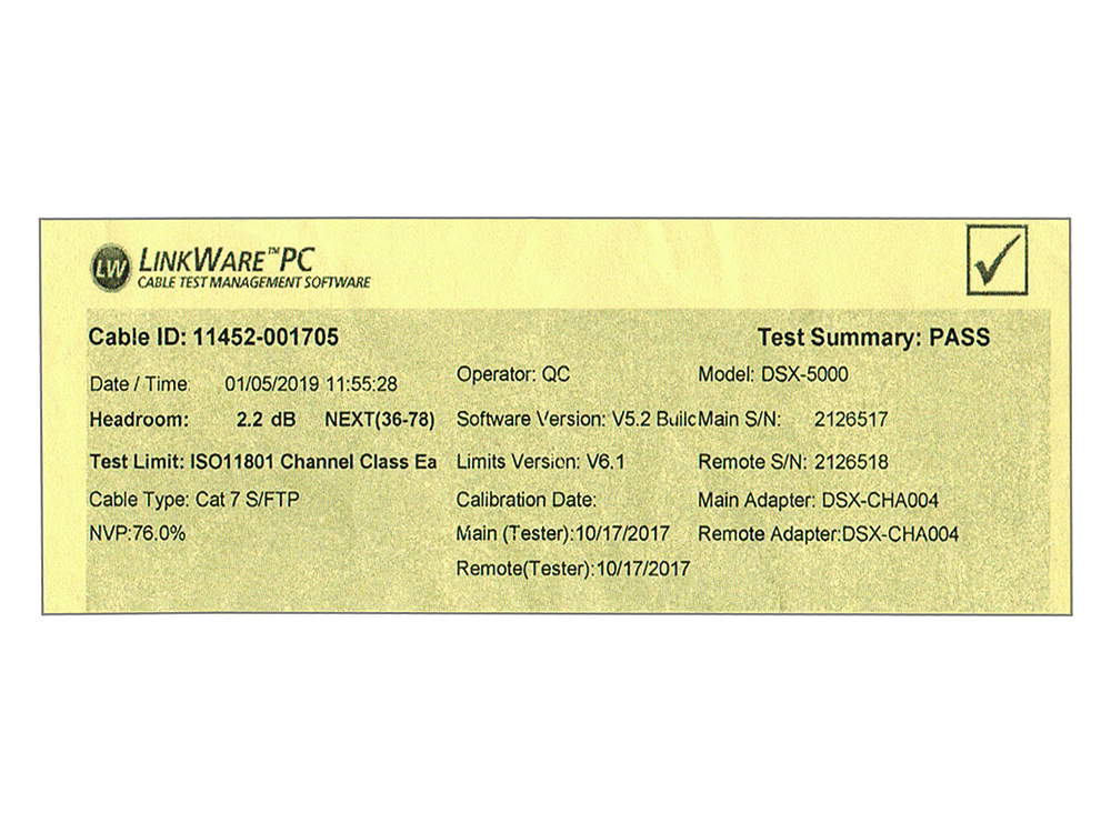 Jedes Patchkabel durchläuft nach der Konfektionierung einen Class EA Channel Link Test. Nach erfolgreicher Messung wird jedes Patchkabel mit einem Wickeletikett inkl. individueller Seriennummer versehen. Auf dem beiliegenden Messprotokoll ist die Seriennummer zur eindeutigen Rückverfolgbarkeit ebenfalls aufgeführt. Anwender und Betreiber von Datennetzen erhalten hierdurch die Sicherheit, dass diese Patchkabel ohne Übertragungsprobleme im Class EA Channel Link arbeiten.