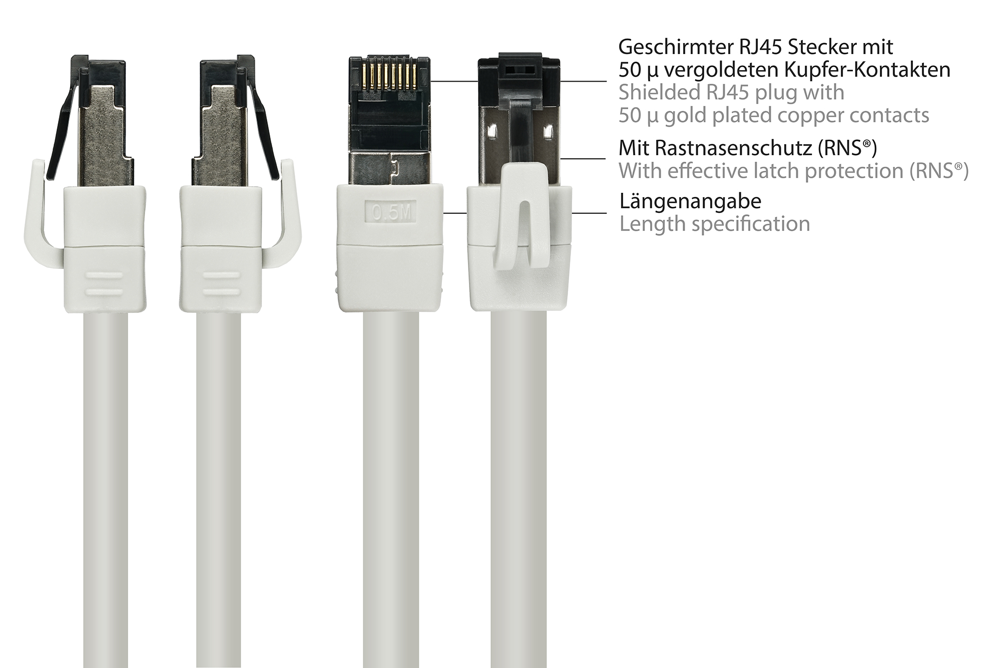 RNS® Patchkabel Cat. 8.1, S/FTP, PiMF, halogenfrei (LSZH), 2000MHz, 40Gbit/s, grau, 0,5m, Good Connections®