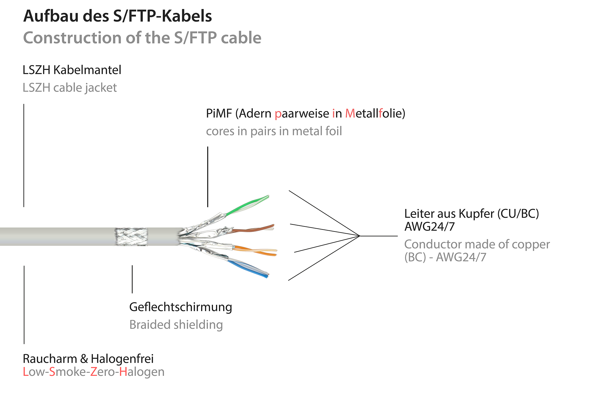 Die S/FTP Schirmung (PiMF) des Kabels und die geschirmten RJ45 Stecker sorgen für eine gleichbleibend hohe und verlustfreie Signalübertragung.