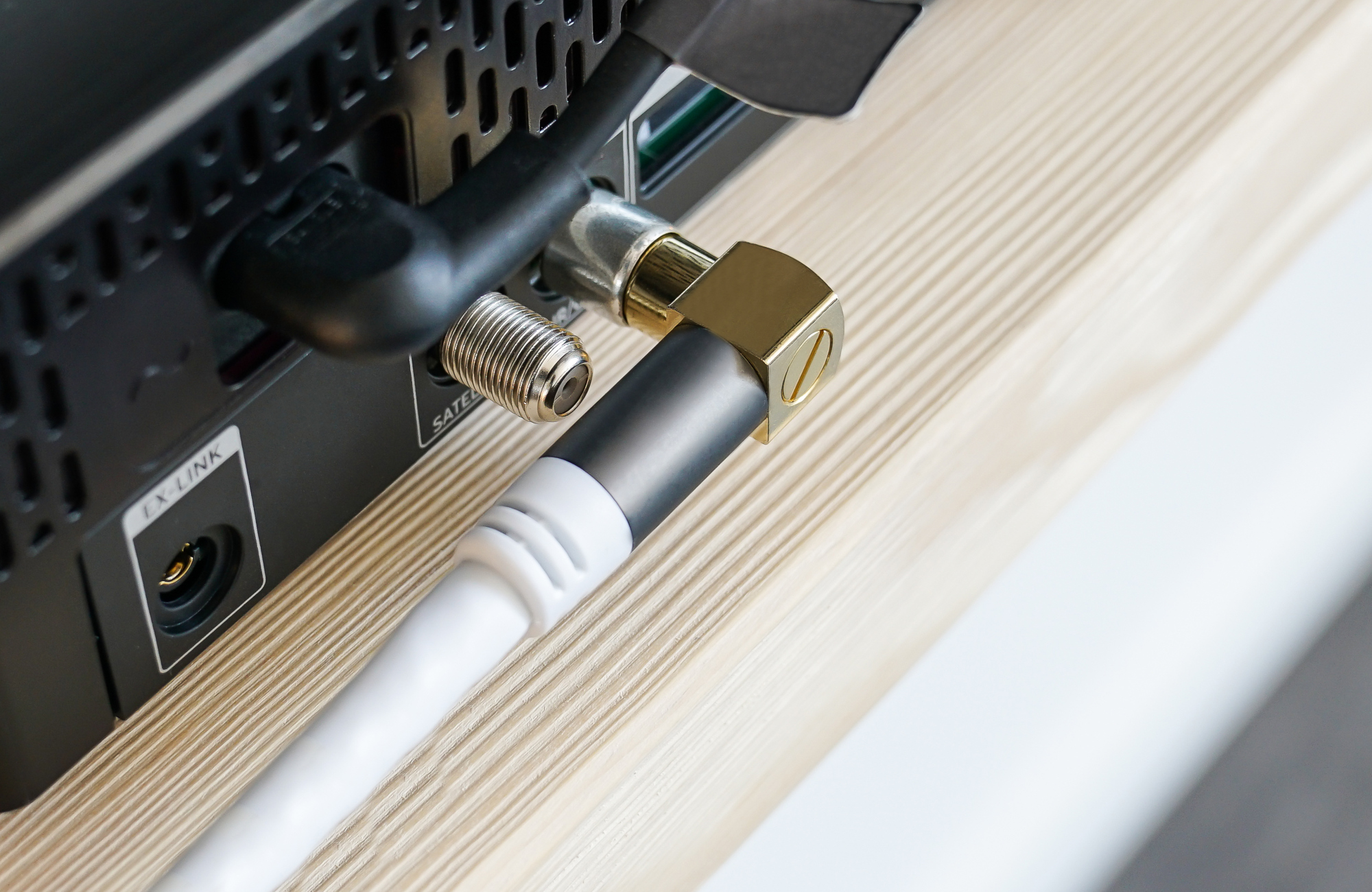 - Vollgeschirmte Anschlüsse: IEC/Koax Winkel-Stecker an IEC/Koax Buchse