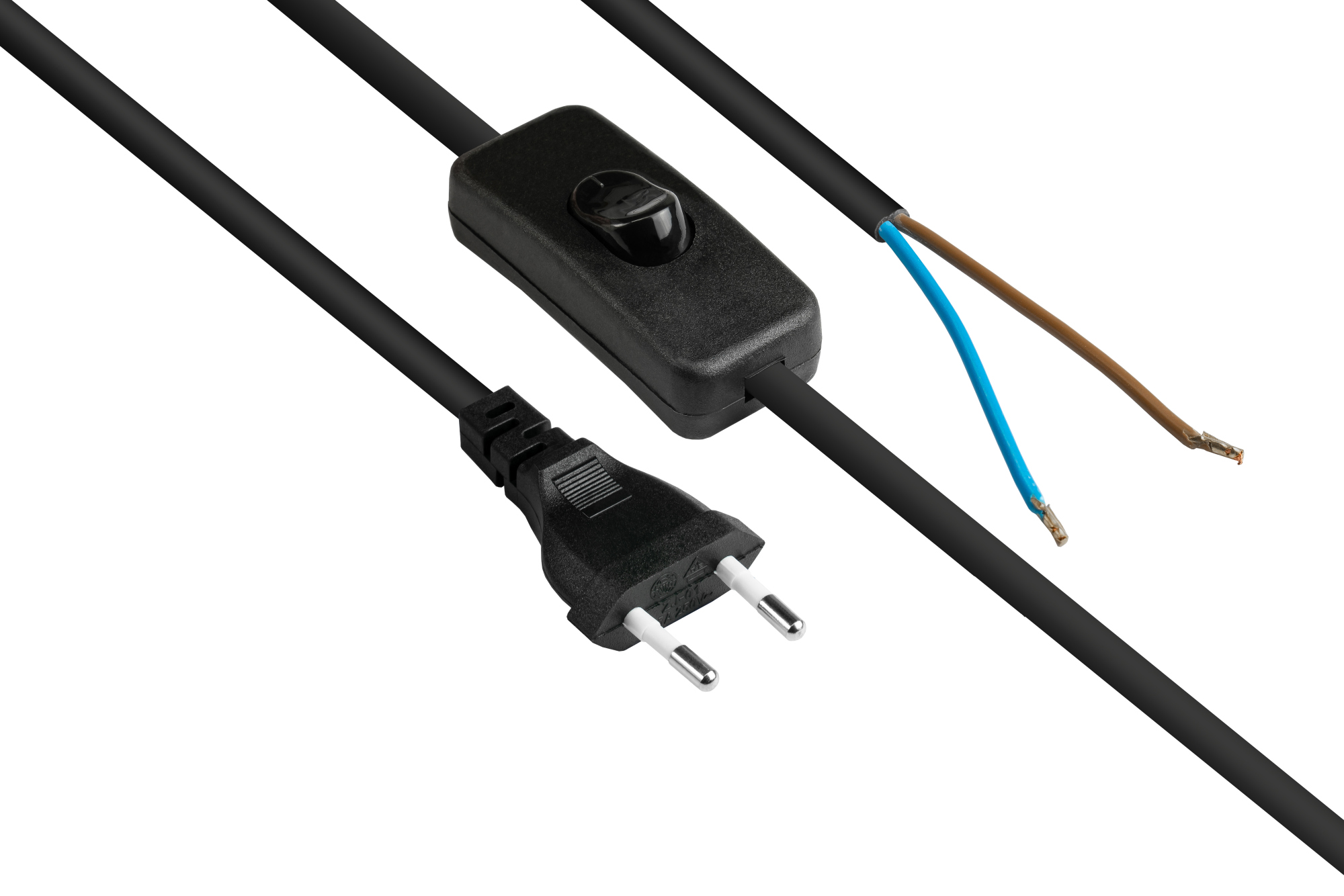 Euro-Netzkabel Euro-Stecker Typ C (gerade) an abisolierte Enden, mit Schalter, schwarz, 0,75 mm², 1,5 m, Good Connections®