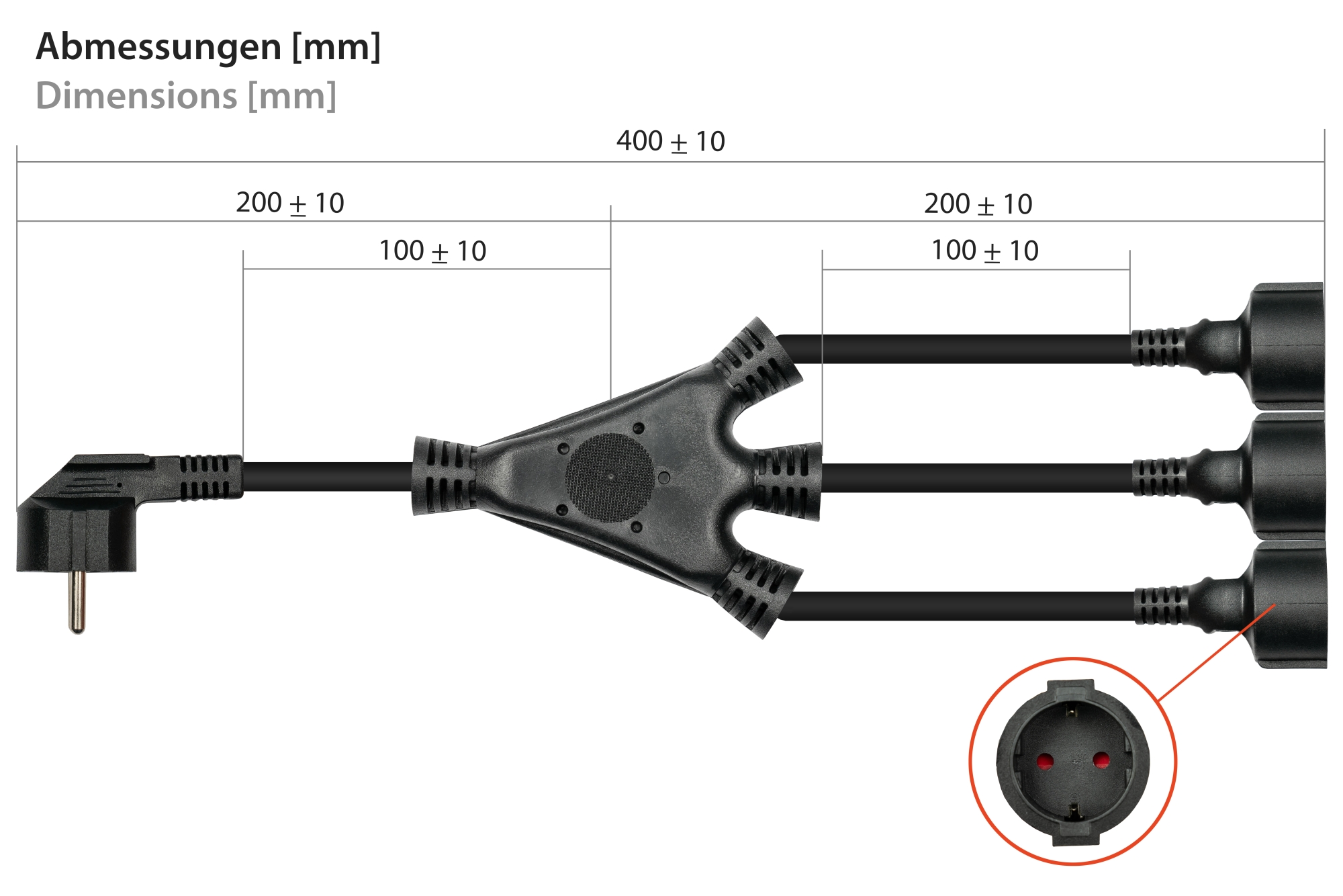 Länge W-Verzweigung bis Schutzkontakt-Buchse: jeweils ca. 0,1 m / 10 cm