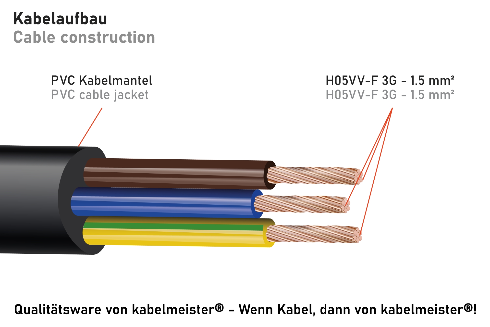 Dabei können Sie auf die bewährte kabelmeister® Qualität vertrauen. Für unsere Netzkabel verwenden wir nur hochwertiges und von der VDE geprüftes H05-VV-F Kabelmaterial. Für mehr Langlebigkeit sind an den Anschlüssen Zugentlastungen angebracht, die für zusätzlichen Schutz und Halt sorgen. Durch den Einsatz moderner Produktionsanlagen, standardisierter Prozesse und hochwertiger Materialien wird eine konstant hohe Verarbeitungsqualität der Produkte erzielt.