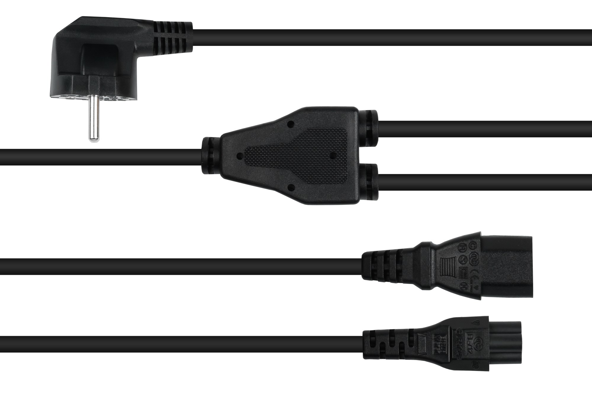 kabelmeister® Y-Netzkabel Schutzkontakt-Stecker Typ E+F (90° gew.) an Buchse C13 und Buchse C5, schwarz, 2m