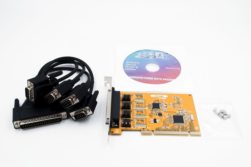 Die EX-41084 PCI I/O Karte stellt vier serielle RS-232 High Performance UART 16C550 Ausgänge zur Verfügung. Sie ist entwickelt worden um vier weiteren Seriellen Ports für PC, kleine Workstation oder Server über den PCI– oder PCI-X Bus zu erweitern. +5V und +12V sind auf Pin 1 und 9 der seriellen Steckers als POS System (Power over System) konfigurierbar. Die Karte ist voll Plug-and-Play kompatibel. Das Octopus Kabel wir mitgeliefert. Die Befestigungs-Schrauben der vier 9 Pin Stecker können mit den mitgelieferten Schraubenmuttern ersetzt werden.