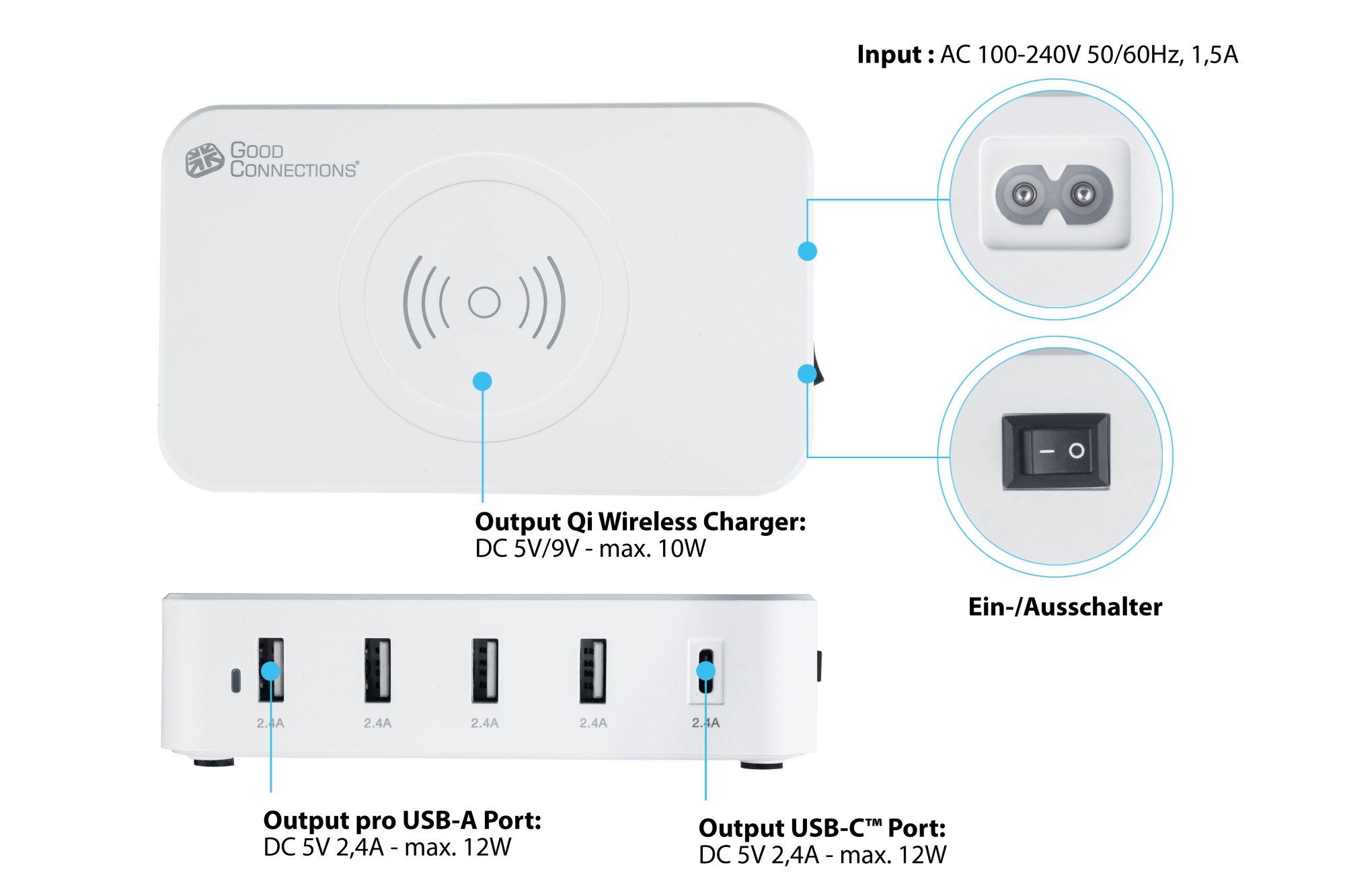 Mit der Good Connections® Schnellladestation mit einem USB-C™- und vier USB-A-Anschlüssen sowie kabellosem Qi Wireless Charging können Sie bequem bis zu sechs Geräte gleichzeitig an einer Steckdose aufladen. Die Schnellladestation unterstützt dabei pro USB-Port bis zu 12W (USB-A / USB-C™) bzw. 10W (Qi Wireless Charging) und bietet im Vergleich zu Standard-Ladegeräten eine deutlich höhere Leistung.