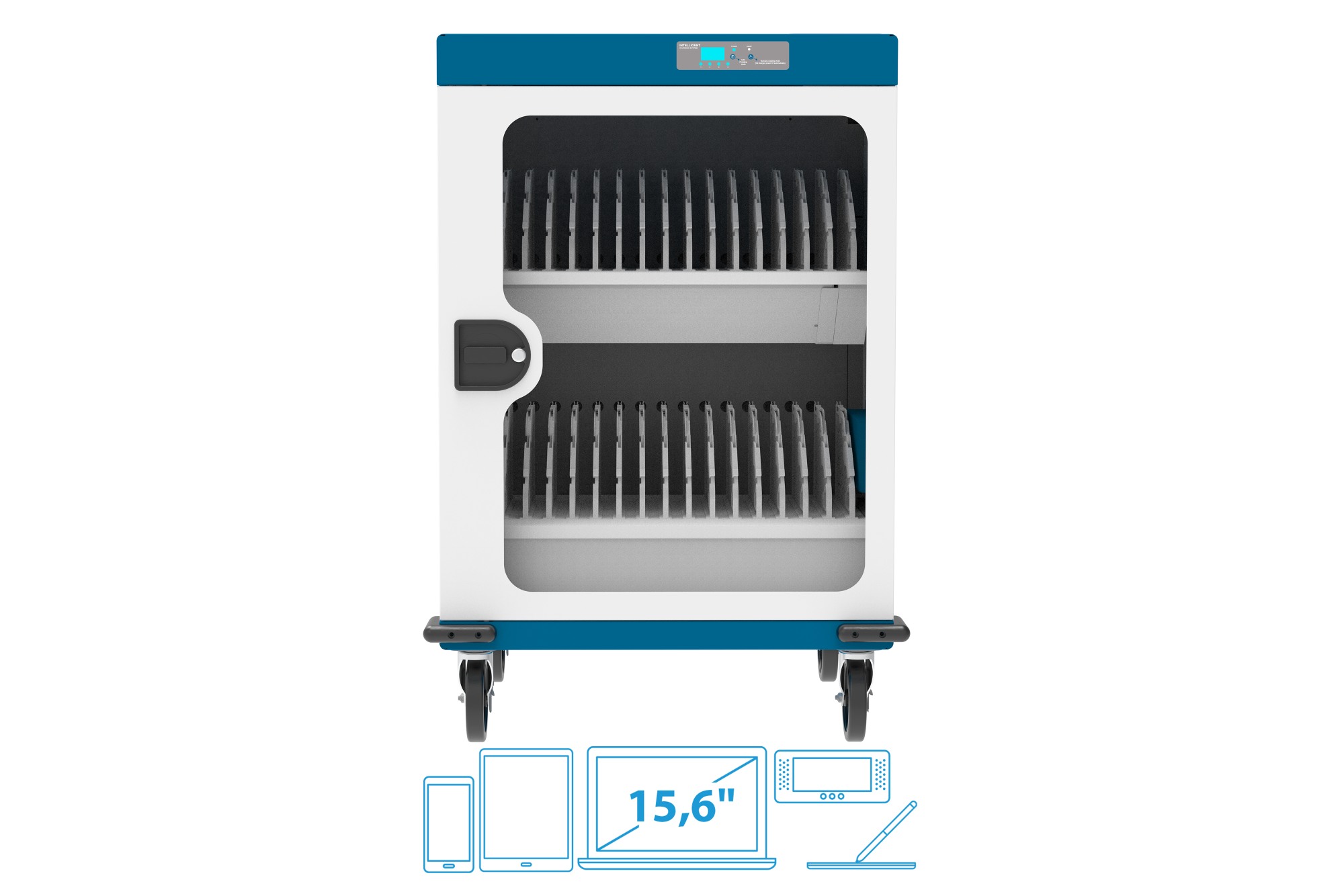 Die nummerierten Fächer dienen der einfachen Zuordnung der Geräte zu den einzelnen Nutzern und fassen jeweils ein, bis zu 15,6“ großes Gerät (Fachabmessungen BxTxH: 2,6 x 41,6 x 25,4 cm).