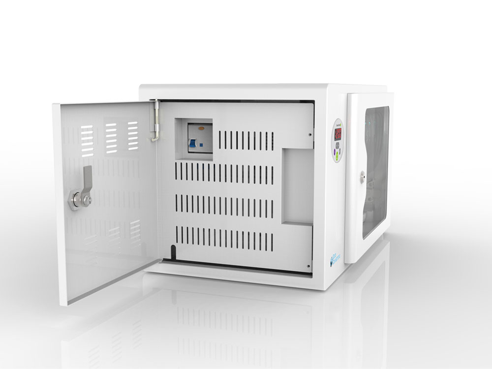 Zum Schutz der Geräte ist der Ladewagen je nach Modell mit bis zu zwei leistungsstarken und leisen Lüftern und einem automatischen Temperaturkontrollsystem ausgestattet. Ab einer Netzteiltemperatur von 45 °C werden die eingebauten Lüfter aktiviert und kühlen zuverlässig die angeschlossenen Geräte.