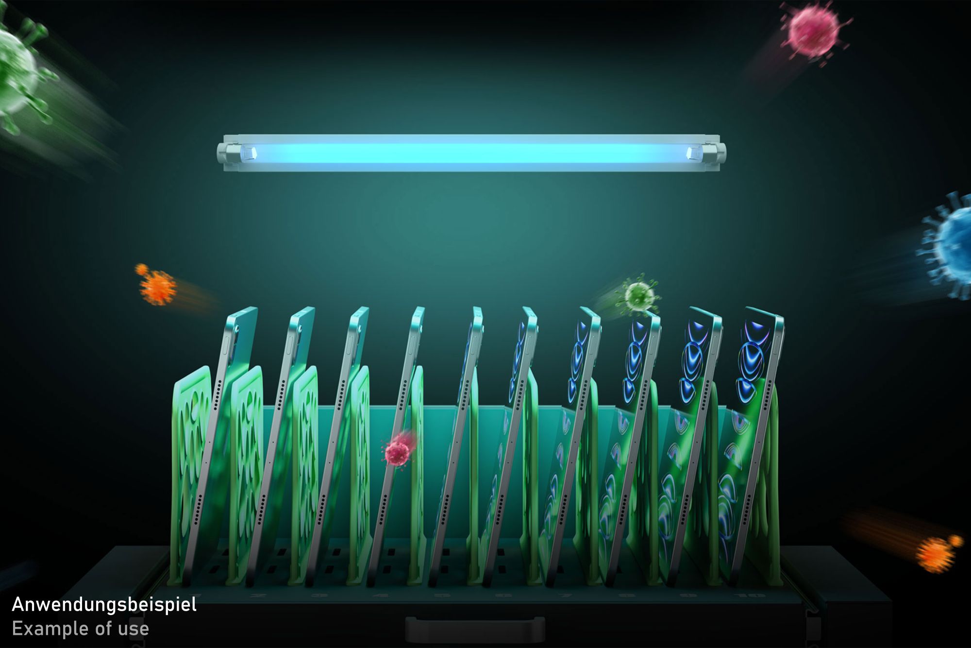 Eine in jeder Ladeebene angebrachte UV-C Lampe sorgt umweltfreundlich und ohne Chemie für sterilere Verhältnisse und eine verbesserte Hygiene. Die ausziehbaren und nummerierten Fächer dienen der einfachen Zuordnung der Geräte zu den einzelnen Nutzern und fassen jeweils ein bis zu 11“ großes Gerät (Fachabmessungen BxTxH: 2,75 x 31 x 20,7 cm).