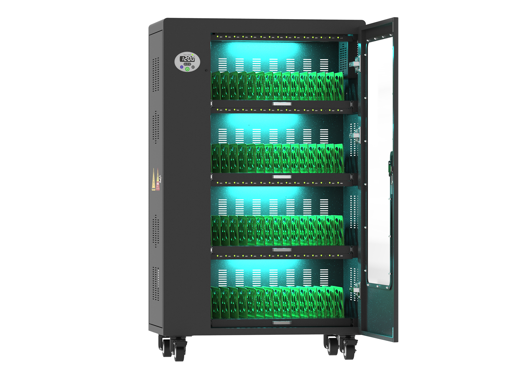 Eine in jeder Ladeebene angebrachte UV-C Lampe sorgt umweltfreundlich und ohne Chemie für sterilere Verhältnisse und eine verbesserte Hygiene. Die ausziehbaren und nummerierten Fächer dienen der einfachen Zuordnung der Geräte zu den einzelnen Nutzern und fassen jeweils ein bis zu 11“ großes Gerät (Fachabmessungen BxTxH: 2,75 x 31 x 20,7 cm).