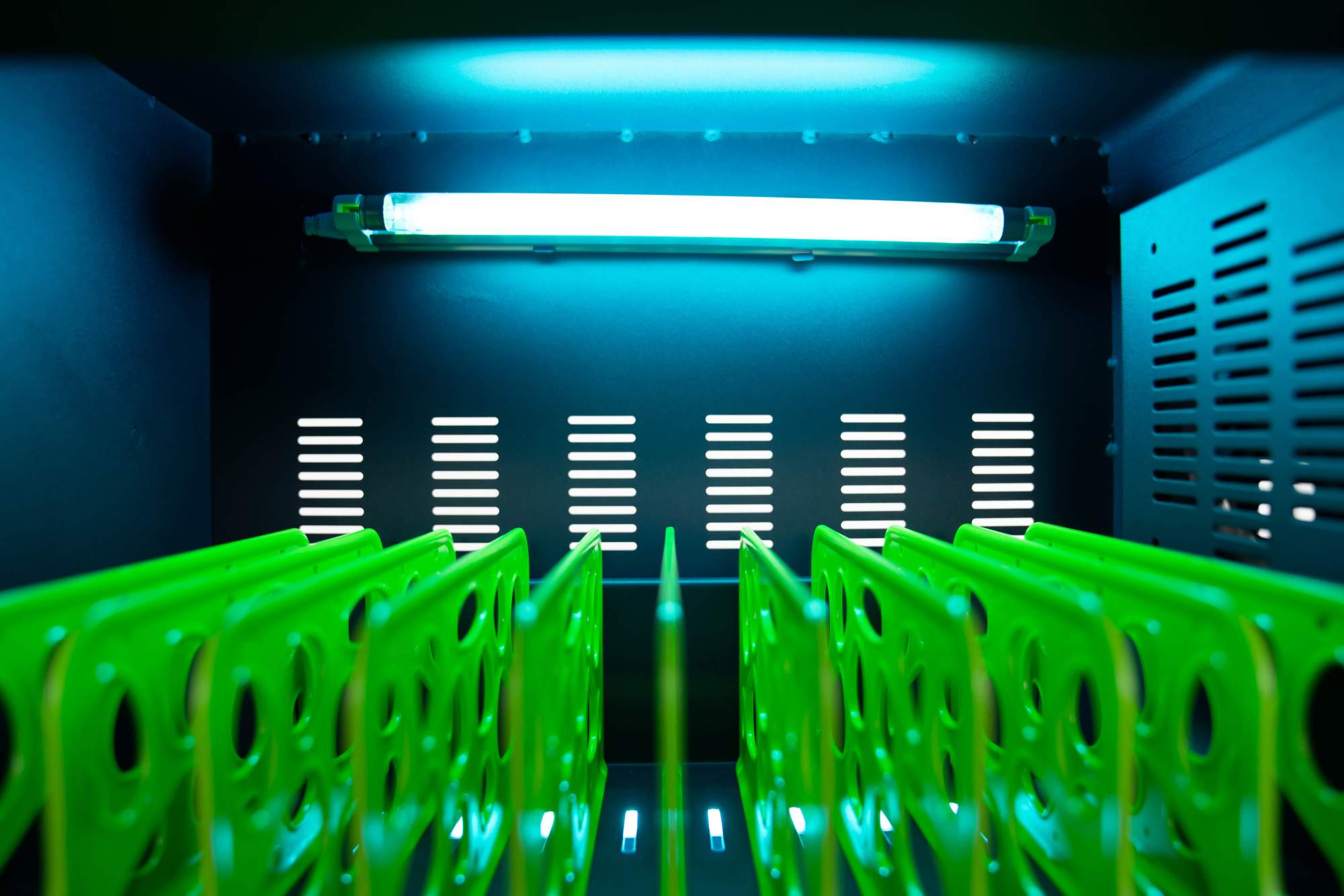 Eine in jeder Ladeebene angebrachte UV-C Lampe sorgt umweltfreundlich und ohne Chemie für sterilere Verhältnisse und eine verbesserte Hygiene. Die ausziehbaren und nummerierten Fächer dienen der einfachen Zuordnung der Geräte zu den einzelnen Nutzern und fassen jeweils ein bis zu 11“ großes Gerät (Fachabmessungen BxTxH: 2,75 x 31 x 20,7 cm).