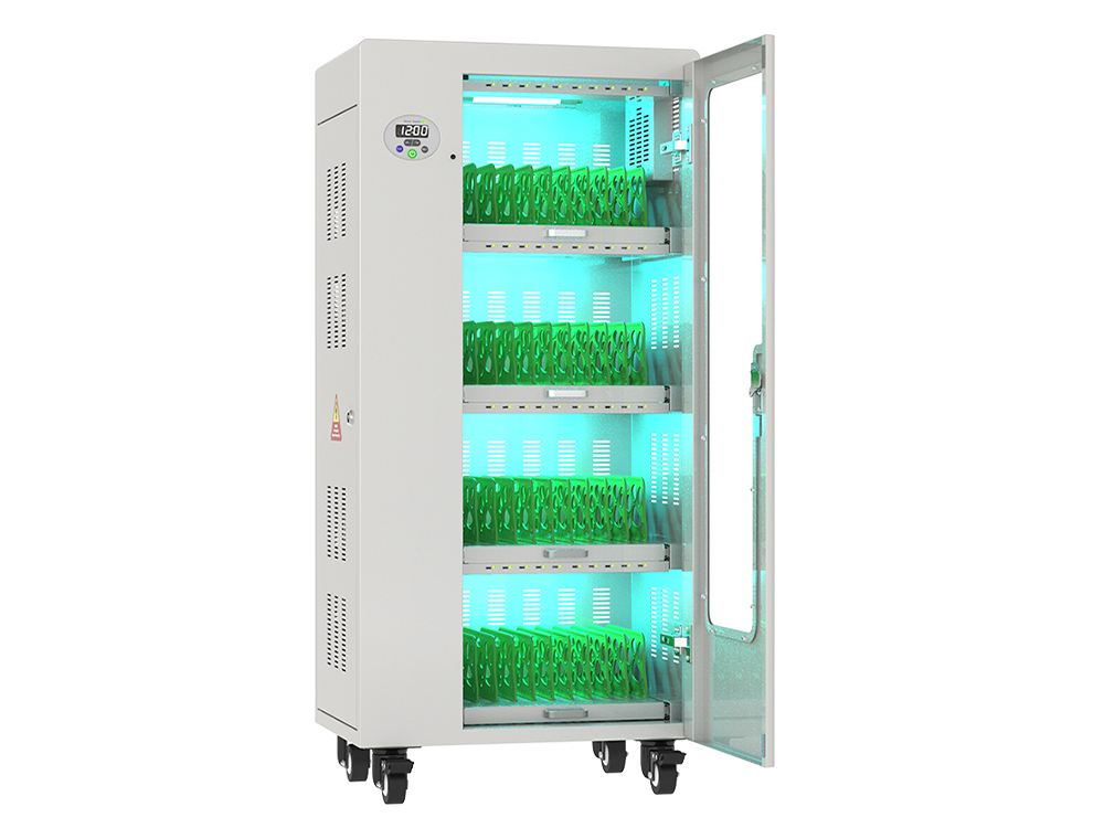 Eine in jeder Ladeebene angebrachte UV-C Lampe sorgt umweltfreundlich und ohne Chemie für sterilere Verhältnisse und eine verbesserte Hygiene. Die ausziehbaren und nummerierten Fächer dienen der einfachen Zuordnung der Geräte zu den einzelnen Nutzern und fassen jeweils ein bis zu 11“ großes Gerät (Fachabmessungen BxTxH: 2,75 x 31 x 20,7 cm).