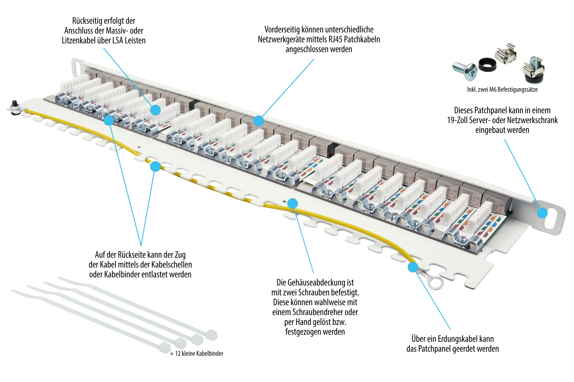 Patchpanel 19" Cat. 6A, 24-Port, 0,5 HE, STP geschirmt, werkzeugloses Öffnen, Reinweiß (RAL9010), Good Connections®