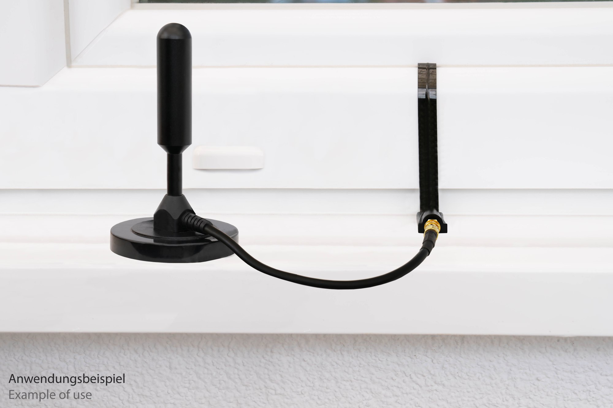 Fenster bzw. Tür öffnen, SMA-Durchführung dazwischen legen, HF-Kabel beidseitig verbinden, Fenster bzw. Tür schließen, fertig! Ein umständliches Bohren durch die Wand entfällt! Für einen besseren Halt können die Anschlüsse zusätzlich mit den beiden mitgelieferten 3M-Klebstreifen fixiert werden.