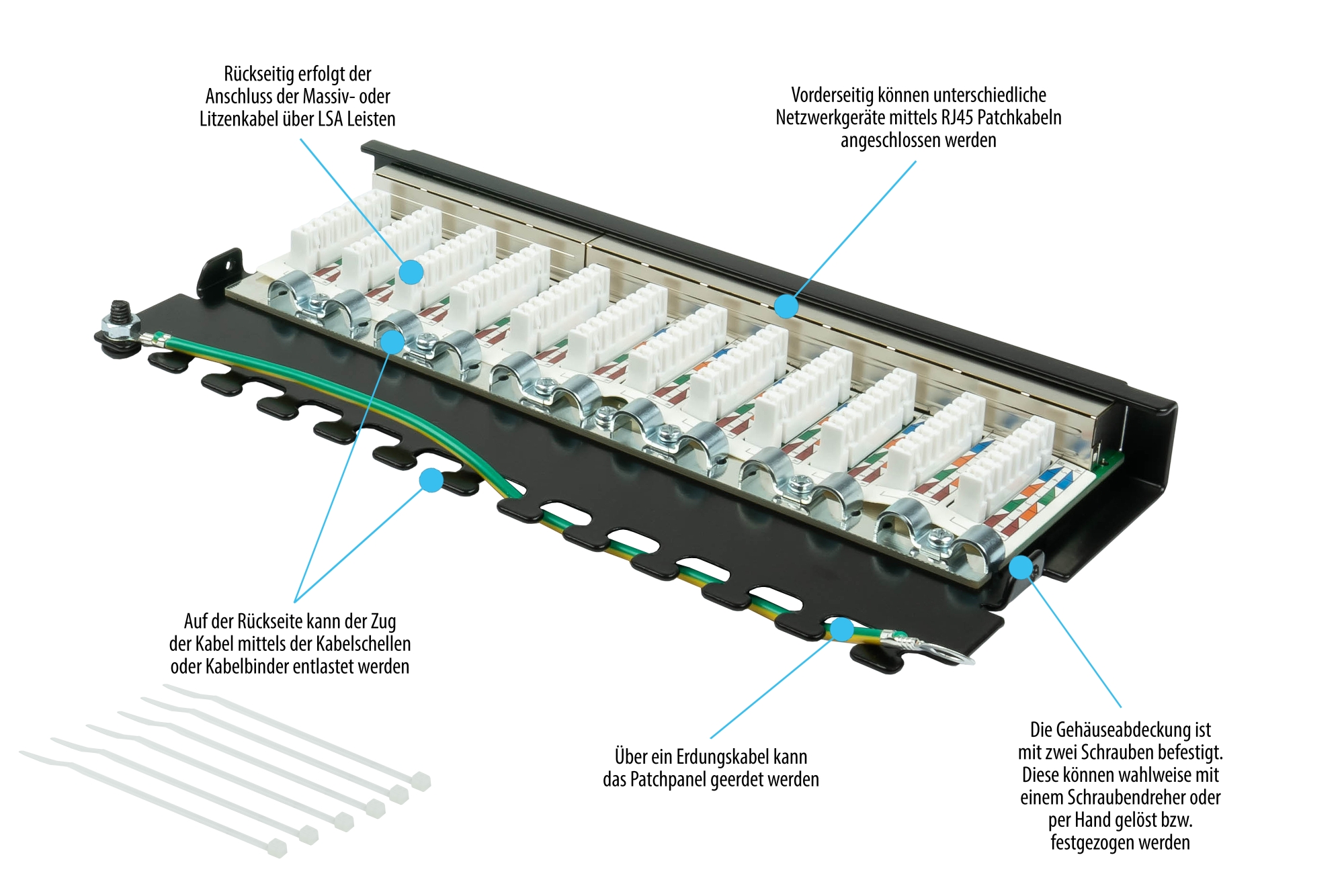 Patchpanel Desktop Cat. 6, 12-Port, 0,5 HE, STP geschirmt, werkzeugloses Öffnen, Tiefschwarz (RAL9005), Good Connections®