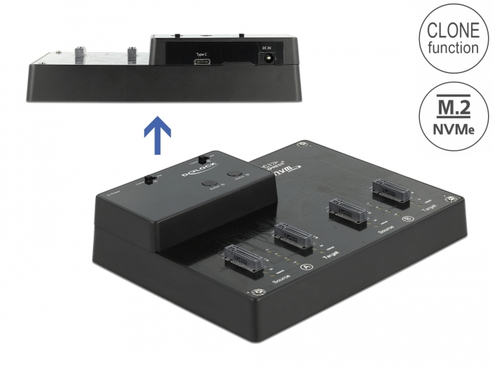 Die Klon Funktion ermöglicht es, Daten von einer SSD auf eine weitere SSD zu kopieren, ohne Verwendung eines PCs. Da die Dockingstation über vier Slots verfügt, können gleichzeitig zwei M.2 SSDs kopiert werden.