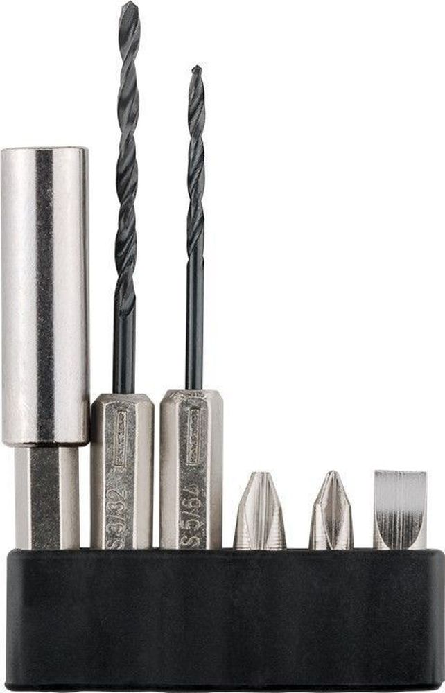 - Inkl. 3x 25 mm CRV Bitsatz, 1x Bitverlängerung, 2x Bohrer 5/64 (2 mm), 3/32 (2,5 mm) und 1x Netzteil